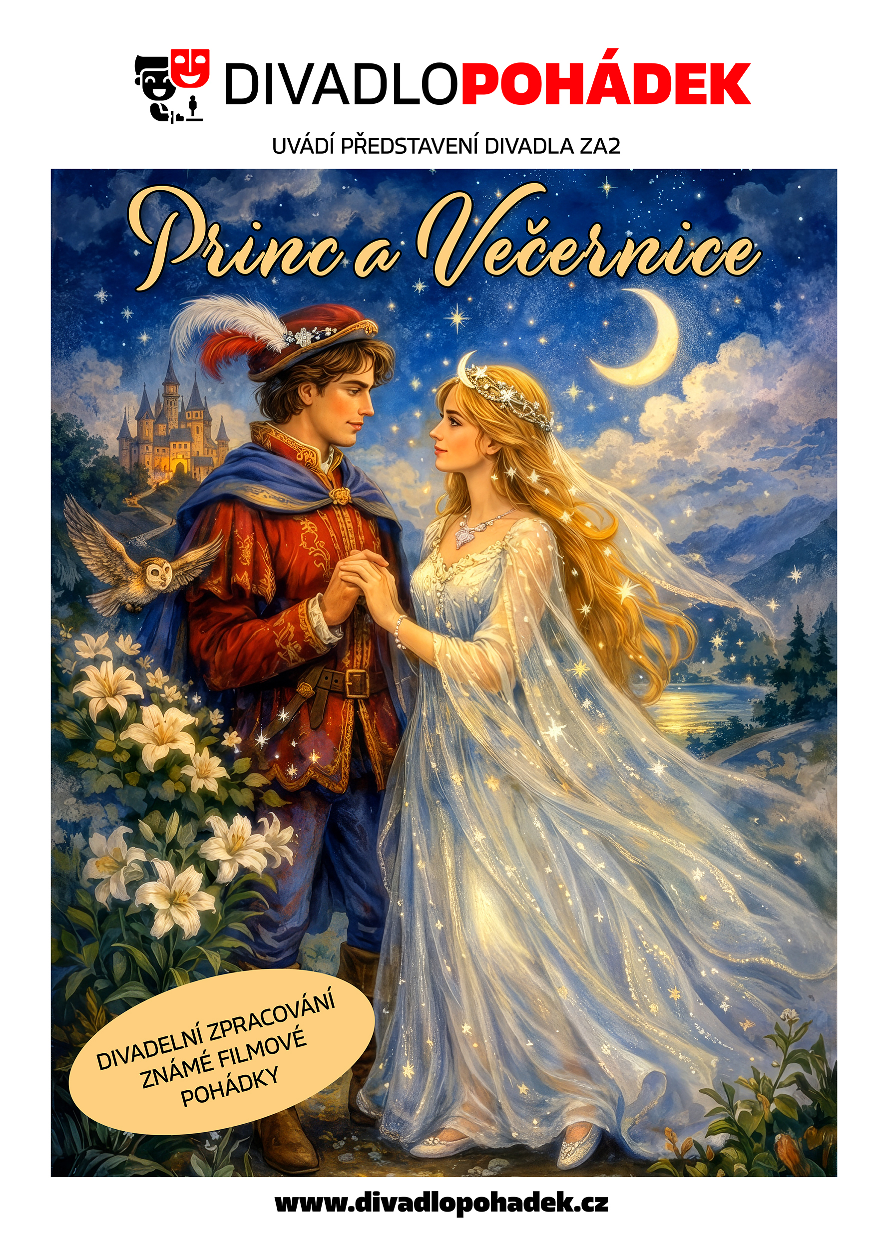 Milujete filmovou klasiku Princ a Večernice? My ji přenášíme přímo na jeviště! Připravili jsme pro vás výpravnou podívanou plnou dobrodružství, napětí a laskavého humoru.
